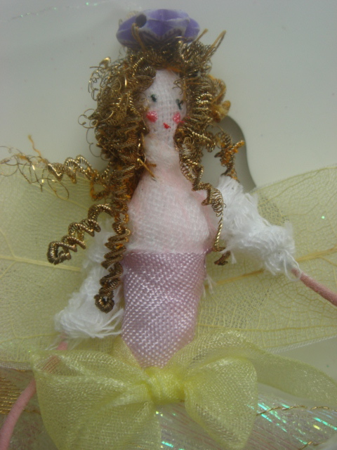 Icicle is made of lace, muslin and silk ribbon. She has stiffened organdie wings and carries a paper rose wand. She also has a tiny white pin in her hair.